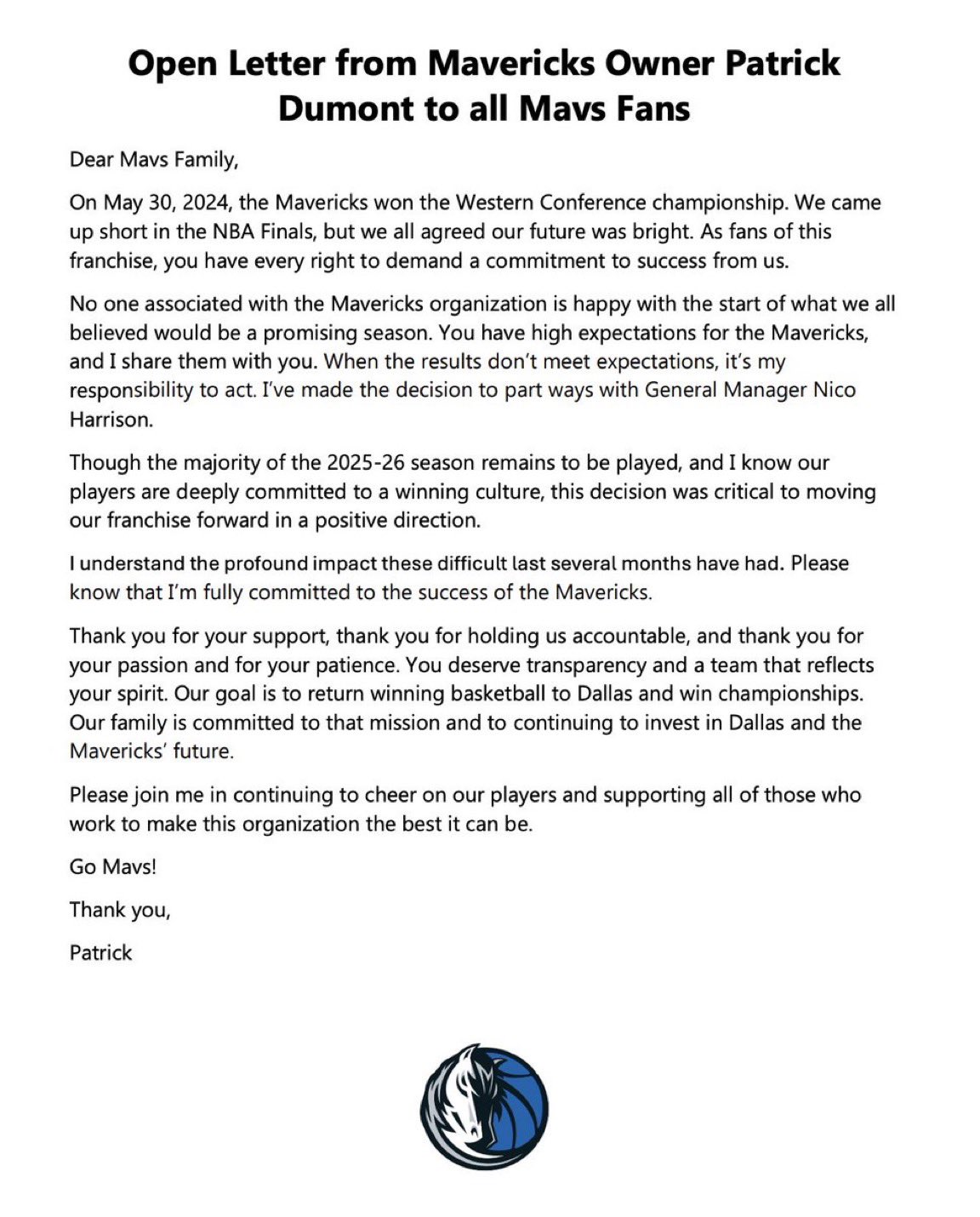 “You have high expectations for the Mavericks, and I share them with you. When the results don’t meet expectations, it’s my responsibility to act.”