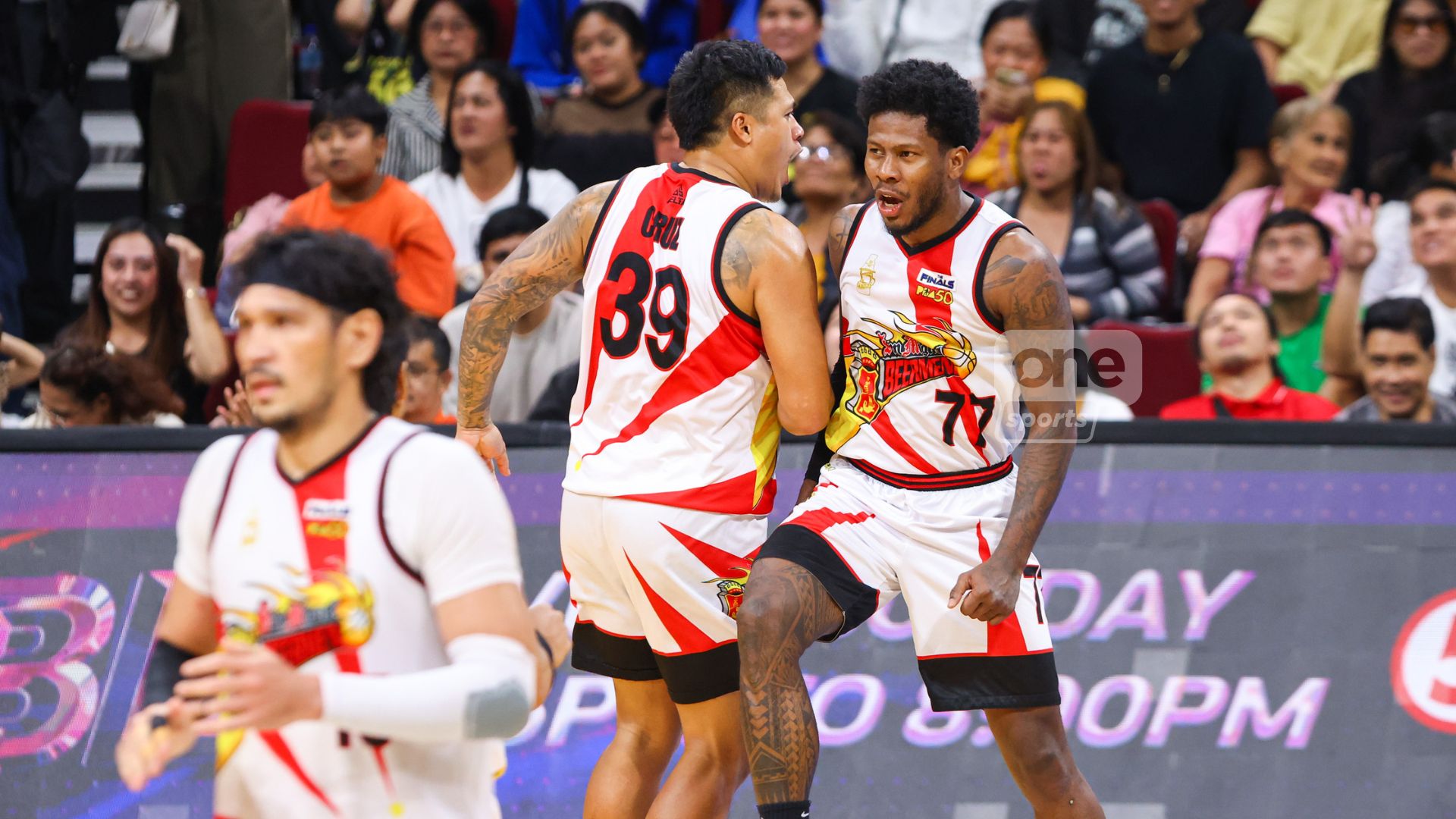 Cjay Perez celebrates with San Miguel teammate Jericho Cruz after nailing the go-ahead four-point shot late in Game 3 of the PBA Finals. | Photo: RM Chua/One Sports
