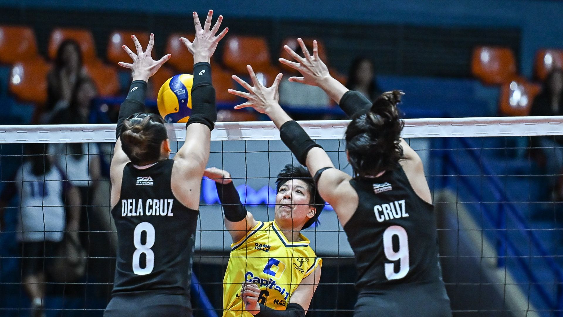 Capital1's Sydney Niegos spikes the ball past Farm Fresh blockers. | Photo: PVL