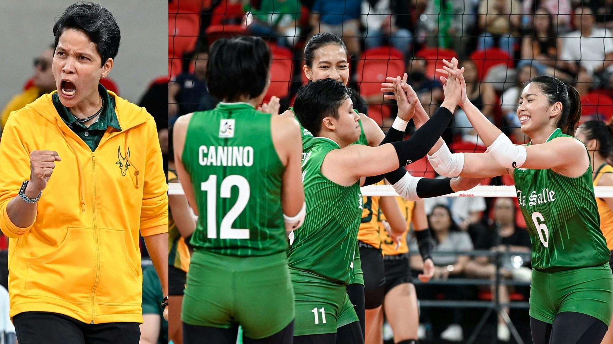 Angel Canino, Alleiah Malaluan give coach Tina Salak her flowers after sweeping FEU